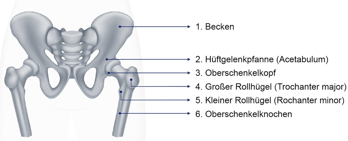 Als Hüfte (Coxa) wird der seitliche Körperabschnitt zwischen dem oberen Rand des Beckens und dem Ansatz des Oberschenkels bezeichnet. Das Hüftgelenk ist das zweitgrösste Gelenk des menschlichen Körpers und verbindet das Becken (1, Pelvis) mit dem Oberschenkelknochen (6, Femur). Dabei wird der kugelförmige Kopf des Oberschenkelknochens (3) zu einem Teil von der Hüftgelenkpfanne (2), einer Vertiefung im Beckenknochen, umfasst. Die beiden knöchernen Oberflächen, die im Gelenk zusammenstossen, sind von einer Knorpelschicht überzogen, die eine reibungslose Bewegung des Gelenks ermöglicht und zusätzlich auch als Stossdämpfer wirkt. Die Gelenkkapsel und ein Bandapparat stabilisieren seine Lage.3